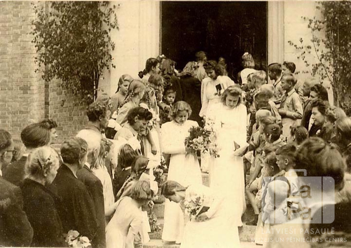 Jaunietes baltos tērpos nāk ārā no baznīcas pēc iesvētībām Eihštetē (amerikāņu zonā). Jaunietēm rokās ir ziedu pušķi un grāmatas. Abpus nācējām stāv divas rindas ar sveicējiem. Kopā bija vairāk nekā 10 iesvētāmie. Abās pusēs ieejai ir novietotas meijas. Vidū nākam ārā no baznīcas ir redzamas: Aija Kārkle, Rasma Upmane.