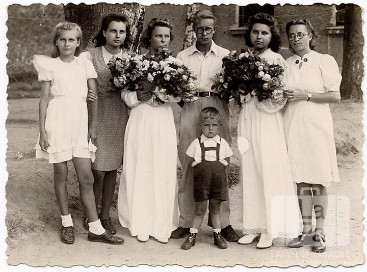 Jauniešu grupa divu meiteņu iesvētībās Eihštetē (amerikāņu zonā). Divām jaunietēm baltos tērpos rokās ir lieli puķu pušķi. Priekšā ir redzams mazs zēns. Fonā ir koki un mūra ēka. Priekšā stāv Jūlijs Elferts. Aizmugurē, no kreisās: Maija Kārkle (pr. Medne), Ilga Upmane, Aija Kārkle (iesvētāmā), Valdis Kārklis, Rasma Upmane (iesvētāmā), Vija Kārkle.