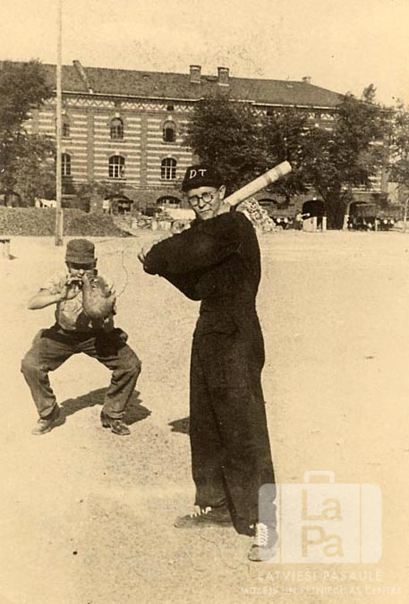 Divi puiši beisbola spēles laikā Rēgensburgas nometnē (amerikāņu zonā). Priekšā stāv puisis ar beisbola nūju, atvēzējies sitienam. Aizmugurē stāv otrs puisis ar cimdu rokās. Fonā laukums un trīsstāvu mūra ēka. Priekšā stāv Valdis Kārklis.