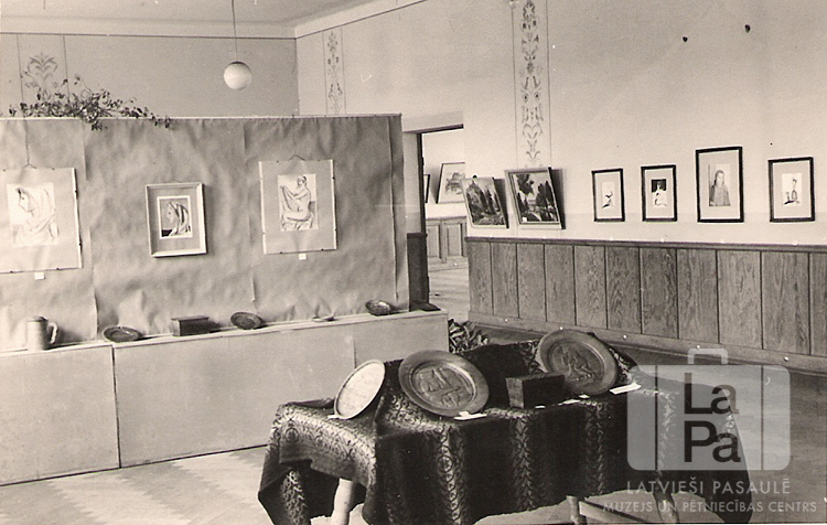 Mākslinieku darbu izstāde Ziemeļu nometnē Vircburgā (amerikāņu zonā). Darbi ir izstādīti gar telpas vairākām sienām un nodalījumiem. Uz priekšējās sienas Osvalda Rožkalna gleznas. Priekšplānā uz galda ir novietoti amatnieku darbi. Telpas dziļumā ir durvis uz izstādes turpinājumu blakus telpā.