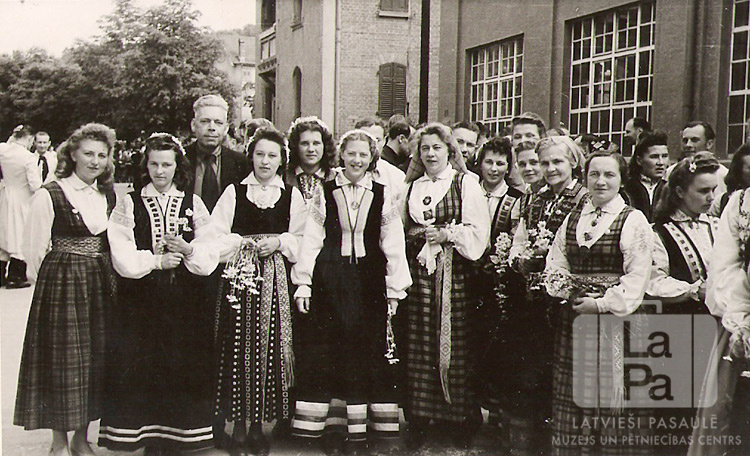 Koristes no Vircburgas Ziemeļu nometnes Dziesmu svētkos Eslingenē (amerikāņu zonā). Sievietes ir ģērbušās tautastērpos. Starp viņām ir redzams vīrietis uzvalkā. Aizmugurē ir citi cilvēki, fonā – mūra ēka ar lieliem, rūtotiem logiem.
