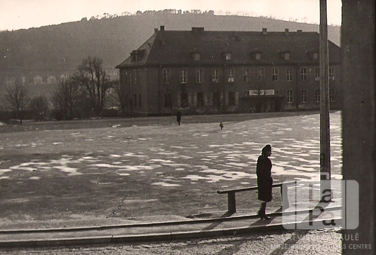Skats uz laukumu un divstāvu dzīvojamo ēku Ziemeļu nometnē Vircburgā (amerikāņu zonā) ap 1946. gadu. Priekšplānā pie koka sola stāv sieviete siluetā, pāri laukumam soļo pieaugušais un bērns. Fonā ir kalns.