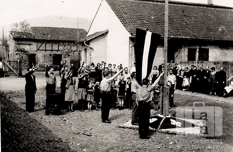 Roveri uzvelk Latvijas karogu Granumas nometnē (angļu zonā). Apkārt stāv skauti ar paceltu labo roku, aiz viņiem stāv skatītāji. Fonā ir vairākas vienstāvu mūra ēkas.