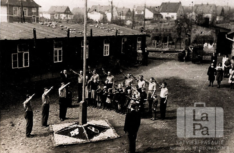 Roveri uzvelk Latvijas karogu Granumas nometnē (angļu zonā). Apkārt stāv skauti ar paceltu labo roku. Aizmugurē, labajā pusē, stāv skatītāji. Fonā ir vienstāvu koka baraka. Tālumā ir vairākas divstāvu mūra ēkas. Attēls ir uzņemts no augšas.