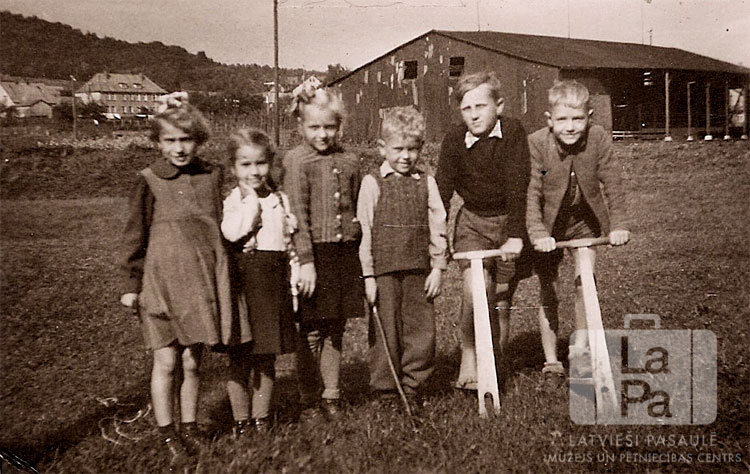 Bērni stāv rindā Granumas nometnē (angļu zonā). Divi zēni labajā pusē stāv uz skrejriteņiem, vienam zēnam rokās ir nūja. Fonā ir vienstāvu koka baraka, tālumā ir vairākas mūra ēkas nogāzes apakšā. No kreisās: Ruta Dreimanis, Gunta Vītoliņš, Maija Vītoliņš (pr. Tebēcis), Andrejs Rācenis, Ansis Bite un Jānis Skabardis.