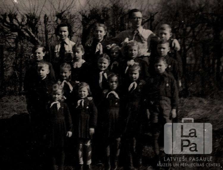 Guntiņas, gaidas un skauti vairākās rindās Granumas nometnē (angļu zonā). Pēdējā rindā stāv arī audzinātājs. Visi ir ģērbušies formastērpos. Fonā ir dzīvžogs bez lapām.