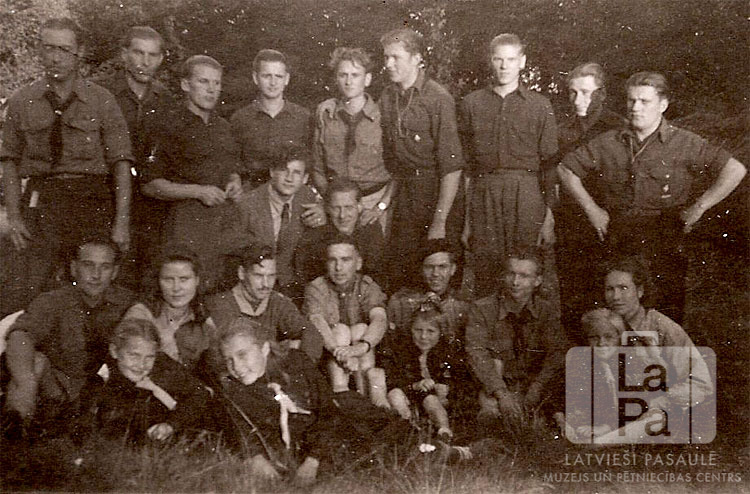 Roveri Granuma nometnē (angļu zonā). Priekšējā rinda sēž zālē uz zemes, viņu vidū arī vairākas gaidas. Otrā rinda stāv kājās. Visi ir ģērbušies formastērpos. Fonā mežs. Par šo gadījumu Maija Tebēcis (dz. Vītoliņš) atceras: "Lielākā daļa vieninieki puiši atšķirti no savām ģimenēm."