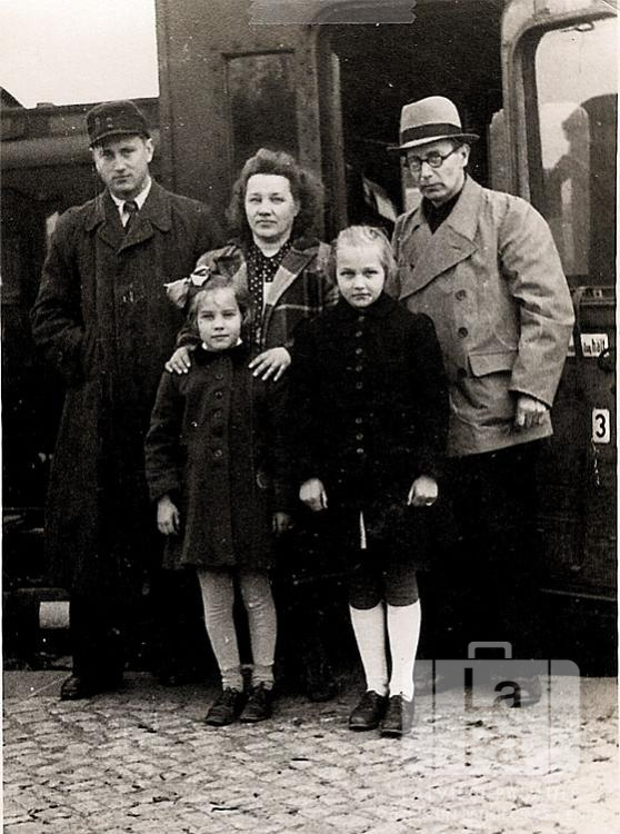 Vītoliņu ģimene pie vilciena Fallingbosteles dzelzceļa stacijā (angļu zonā). Priekšā stāv divas meitenes, aizmugurē stāv trīs pieaugušie. Priekšā, no kreisās: Gunta Vītoliņš un Maija Vītoliņš (pr. Tebēcis). Aizmugurē, no kreisās: Laimons Kļaviņš, Alma Vītoliņš un Roberts Vītoliņš.