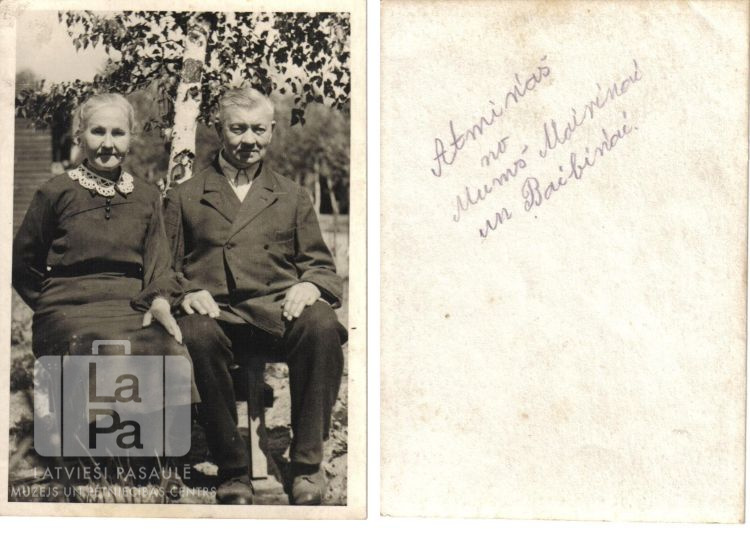 Vecāks latviešu pāris Volterdingenes nometnē (angļu zonā). Kreisajā pusē vecs kungs un kundze sēž zem bērza; attēlā otrajā pusē ir ar roku rakstīts: “Atmiņās no Mums- Mairiņai un Baibiņai.”