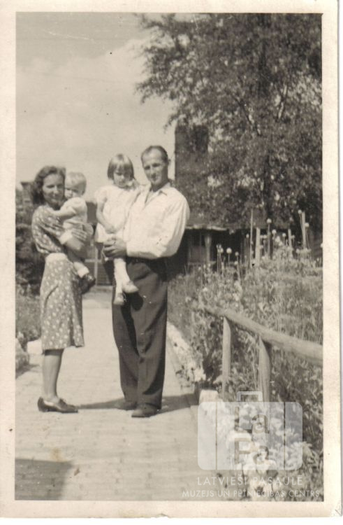 Alužānu ģimene uz bruģētas takas Volterdingenes nometnē (angļu zonā). Stāv sieviete un vīrietis, katram no viņiem ir meitene uz rokām. Fonā ir redzama koka vienstāvu baraka. No kreisās: Alma Alužāne, Baiba Alužāne (bērnībā), Maira Alužāne (bērnībā; pr. Valdmanis) un Alfreds Alužāns.