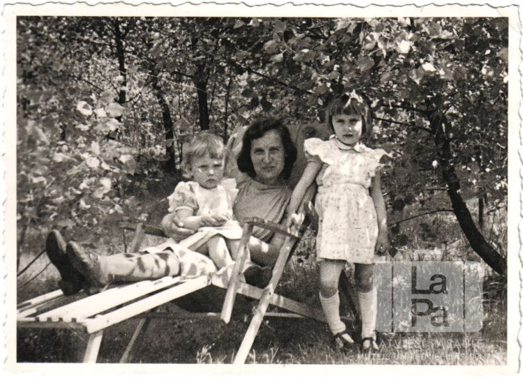 Baiba Alužāne ar meitām atpūtas krēslā Dedelstorfas nometnē (angļu zonā). Sieviete guļa krēslā, viena meitene ir klēpī, bet otra stāv labajā pusē pie krēsla. Apkārt ir augļu dārzs. No kreisās: Baiba Alužāne, Alma Alužāne un Maira Alužāne (pr. Valdmanis).