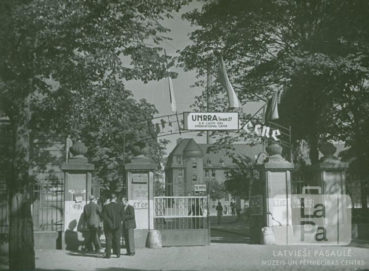 Galvenie vārti Hānavas nometnē (amerikāņu zonā). Caur vārtiem dodas jaunu vīriešu grupa. Virs vārtiem ir uzraksts: "UNRRA Team 27". Zemāk teksts ir nesalasāms. Aiz vārtiem pastaigājas cilvēki, ir redzamas vairākas mūra ēkas. Abās pusēs vārtiem aug vairāki augsti koki.