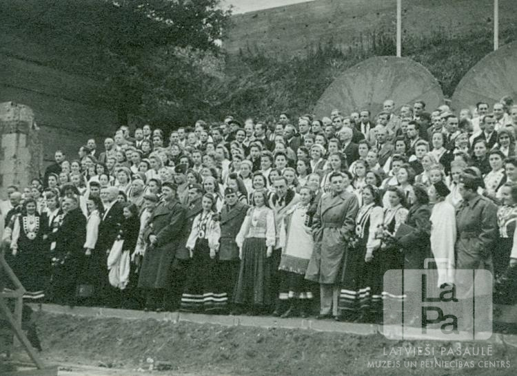 Skatuve ar koristiem Dziesmu svētkos Hānavā (amerikāņu zonā). Sievietes ir ģērbušās tautastērpos, vīrieši – mēteļos un uzvalkos. Fonā aiz estrādas uz nogāzes, ir redzami karogu masti un mūris.