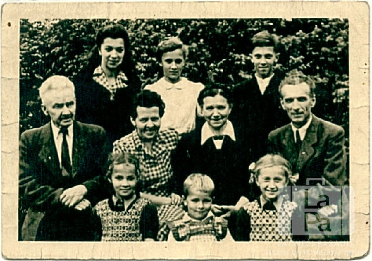 Freidenfeldu ģimene Fallingbostelē (angļu zonā) pirms šķiršanās no vecvecākiem. Grupas portrets – 10 cilvēki stāv 3 rindās, bērni priekšā. Fonā krūmi. Pirmajā rindā, no kreisās: Māra Freidenfelde (pr. Siksna), Uģis Freidenfelds, Ieva Freidenfelde. Otrajā rindā, no kreisās: Kārlis Plošs, Regīna Freidenfelde, Alma Ploša, Laimons Freidenfelds. Trešajā rindā, no kreisās: Rasa Freidenfelde, Maija Freidenfelde, Inga Freidenfelds. Par šo gadījumu Māra Siksna (dz. Freidenfelde) atceras: "Tā kā bijām 10 cilvēki, mums bieži laimējās nometnēs dabūt kādu istabu sev vien un nedzīvot kopā ar svešiem. Kaut mēs citi šai fotogrāfijā smaidām, liekas, ka vectēvs vienīgais nojauta, ka drīz šķiramies uz mūžu. Vecmāti man, Ingam un vecākiem vēl izdevās satikt pirms viņas nāves."