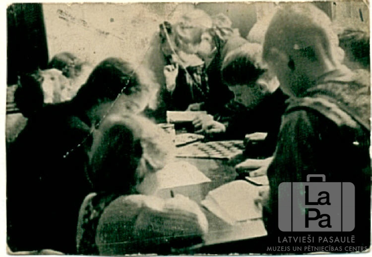 Bērni sēž ap galdu Mērbekas nometnē (angļu zonā). Bērni gan zīmē, gan raksta, gan citādi darbojas. Galda kreisajā pusē, no priekšas: Ieva Freidenfelde, Rasa Freidenfelde, Māra Freidenfelde (pr. Siksna), Maija Freidenfelde. Galda labajā pusē, no beigām: Vija Ramiņš, Margita Ramiņš, Inga Freidenfelds, Ints Dzelzgalvis (priekšā, pagriezies ar muguru). Par šo gadījumu Māra Siksna (dz. Freidenfelde) atceras: "Mērbekā uz neilgu laiku dzīvojām kopā ar mātes māsām un viņu ģimenēm, pirms Ramiņi aizbrauca uz Kanādu un Dzelzgalvi uz ASV. Vakaros netrūka palīgu mazākiem skolēniem un dalībnieki kāršu un citās spēlēs. Pie lielā galda vakaros sanāca visi, kam vajadzēja virsmu spēlēm, mājas darbiem vai zīmēšanai. Pie šī galda man tēvs ar roku darināja manu pirmo lasāmo grāmatu – Mārītes grāmatu, pārzīmējot Margaritas Kovaļevskas illustrācijas un lapas uzlīmējot uz UNRRAS pakas papes plāksnēm."