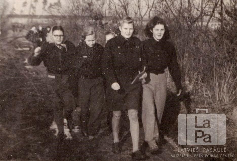 Gaujas 71. gaidu vienības Irbīšu kops šķēršļu gājienā Rotenburgas nometnē (Vimmē, angļu zonā). Takai apkārt ir krūmi, caur tiem ir redzama ūdenstilpe. Par šo gadījumu Māra Zirne (dz. Cibante) atceras: "Gaidām bija jāseko norādījumiem un jāizpilda šķēršļu uzdevumus."
