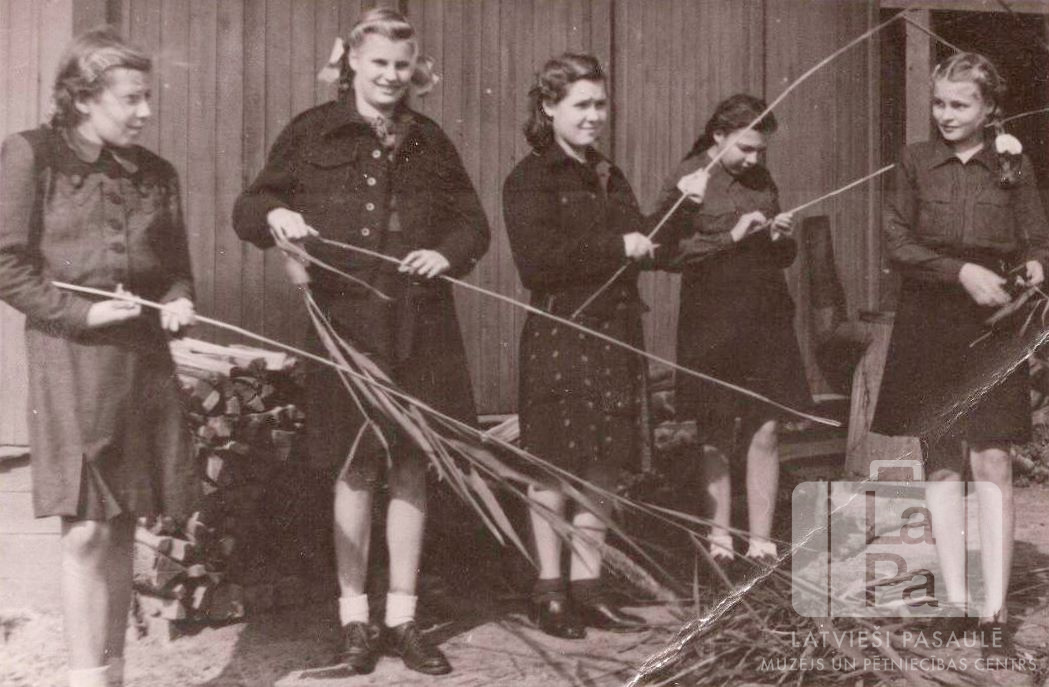 Gaujas 71. gaidu vienības Irbīšu kops gatavo klūgas grozu vīšanai Rotenburgas nometnē (Vimmē, angļu zonā). Aiz meitenēm ir redzama saskaldītas malkas grēda pie koka dēļu sienas. No kreisās: Lidija Vaļska, Māra Cibante (pr. Zirne), Rasma Buiķe, Alna Blauss un Nora Blauss.