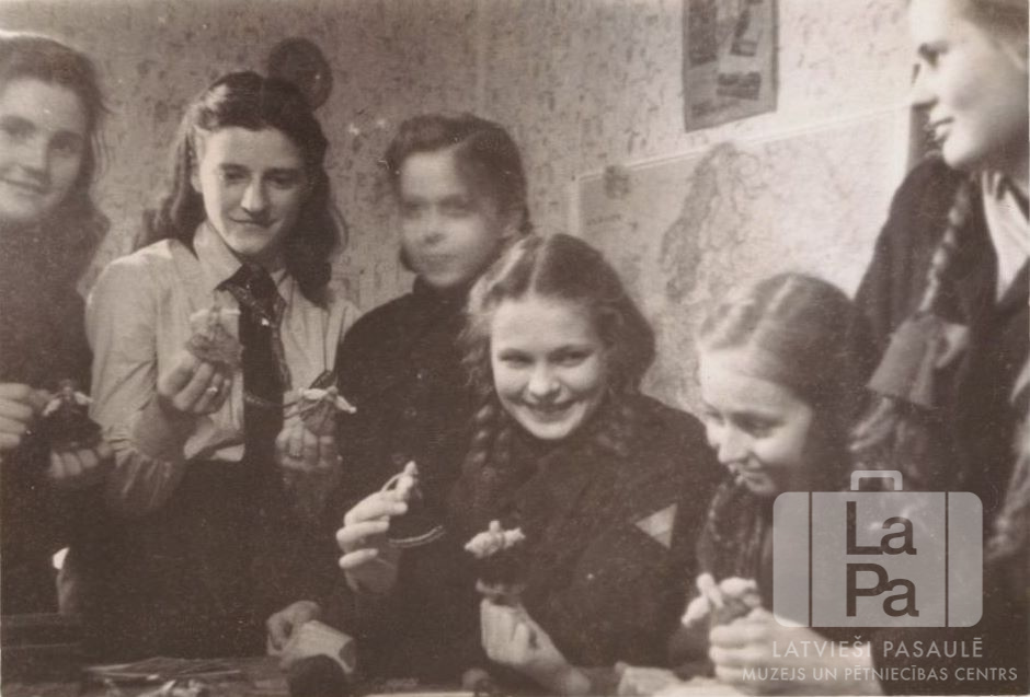 Gaujas 71. gaidu vienības Irbīšu kops nodarbībās Rotenburgas nometnē (Vimmē, angļu zonā). Sešas gaidas istabā gatavo mazas, tautiskas lellītes no dzijas (iespējams, dāvanām vai tirdziņam). Fonā uz sienas ir Eiropas karte.