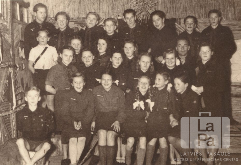 Gaidas un skauti mītnes vakarā Rotenburgas nometnē (Vimmē, angļu zonā). Grupas vidū ir arī Gaujas 71. gaidu vienības Irbīšu kops un arī Ventas 108. skautu vienība. Visi ir ģērbušies formastērpos. Koka telpas iekārtojums ar, iespējams, salmu sienām aizmugurē.