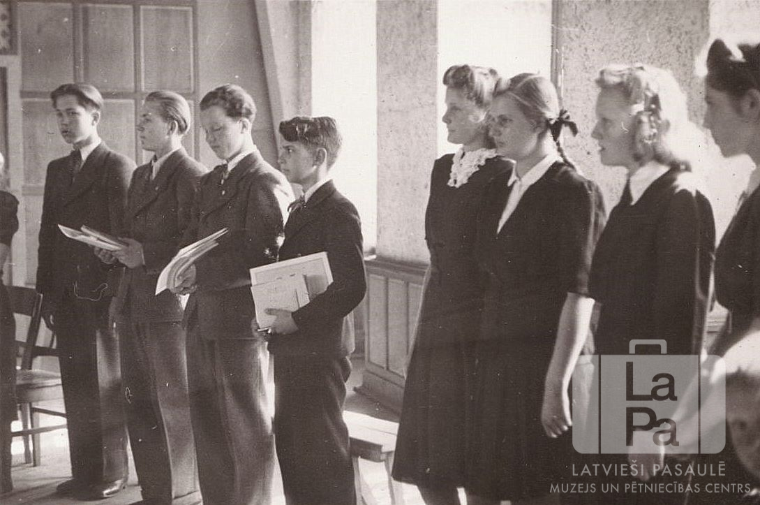 Pamatskolas absolventi saņem diplomus un piemiņas grāmatas Emdenes nometnē (angļu zonā). Jaunieši stāv rindā telpā ar koka sienu paneļiem. Kreisajā pusē stāv puiši, labajā – jaunietes. Labajā pusē ir logi. No kreisās: Valdis Lielkājs, Lūcijs Pārups, Ojārs Āboliņš, Silvestrs Zariņš, Inta Amstere, Māra Cibante (pr. Zirne), Vera Voicisa, Inese Cīrule.