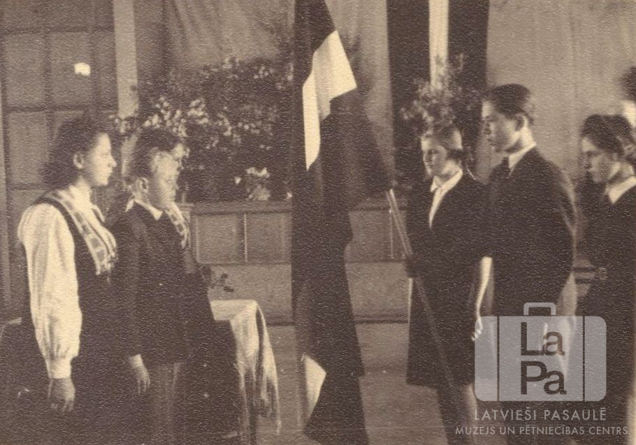 Skolas karoga nodošana pamatskolas izlaidumā Emdenes nometnē (angļu zonā). Seši jaunieši stāv divās rindās viens otram pretī, viņiem pa vidu ir Latvijas karogs. Aizmugurē ir galds, pie sienas ir nolikti ziedi un izkarināts Latvijas karogs. No kreisās: Valda Lipiņa, nezināms, Beate Nesaule, Māra Cibante (pr. Zirne), Valdis Lielkājs un Inese Cīrule.