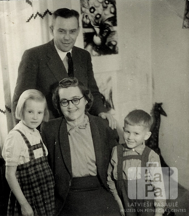 Stīpnieku ģimene savā istabā Ziemeļu nometnē Vircburgā (amerikāņu zonā) ap 1945. gadu. Priekšā sēž māte ar bērniem – meitu un dēlu –, bet tēvs stāv aizmugurē. Fonā ir istabas iekārtojums – gulta, aizkari pie loga, glezna pie sienas. Kādu laiku visa ģimene dzīvoja vienā lielā istabā – 2 bērni un 9 pieaugušie. Priekšā, no kreisās: Maija Stīpnieks (pr. Auliciema), Margarita Stīpnieks (dz. Klēbachs), Andrejs Stīpnieks. Aizmugurē stāv Eduards Stīpnieks.