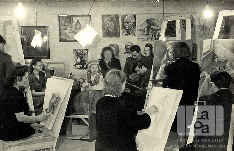 Mākslinieku darbnīca Ziemeļu nometnē Vircburgā (amerikāņu zonā) ap 1947. gadu. Telpas vidū sēž meitene tautastērpā ar lelli rokās; apkārt viņai sēž mākslinieki ar molbertiem. Fonā pie sienas, ir mākslinieku darbi. Redzamas vairākas griestu spuldzes.