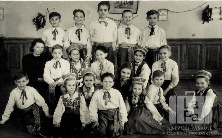 Bērnu tautas deju grupa "Jautrais pāris" tautastērpos Ziemeļu nometnē Vircburgā (amerikāņu zonā). Bērni (ap 8 gadus veci) trīs rindās – pirmās divas rindas sēž, trešā stāv kājās. Pirmajā un otrajā rindā ir arī divas skolotājas. Pirmajā rindā, no kreisās: Heinrihs (?) Zīle, Maija Stīpnieks (pr. Auliciema), Māra Krūmiņa, Ivars Kauls, Gaida Stenders (vadītāja), Lolita Balode, Gunārs Mētra, nezināms. Otrajā rindā, no kreisās: ? Balodis (pavadītāja), Andris Polis, Aina ? (?), Ivars Šeibelis, Vizbulīte (?) Cīrulis un Vilis Ķilpe. Trešajā rindā, no kreisās: nezināms, Zigurds Balodis, Jānis Polis, Teodors Kauls, Imants Viesis. Foto autors: Teodors Kauls (sen).