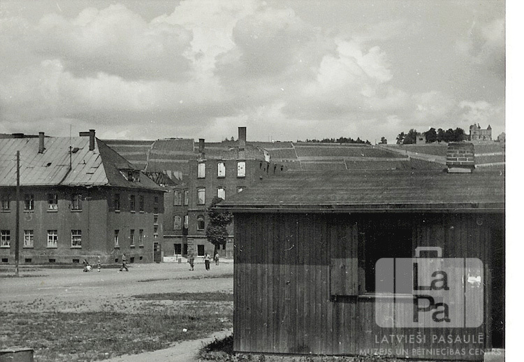 Pagalms ar ēkām Ziemeļu nometnē Vircburgā (amerikāņu zonā). Priekšplānā, labajā pusē, ir vienstāvu koka būda, kreisajā pusē ir plašs pagalms un divstāvu mūru māja. Pāri pagalmam dodas vairāki cilvēki. Fonā aiz nometnes ir pauguraina ainava ar apstrādātiem laukiem un ēku labajā pusē.
