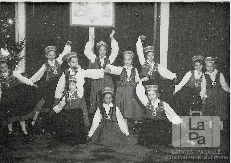Meiteņu grupa tautastērpos pozē Ziemassvētku uzvedumā Ziemeļu nometnē Vircburgā (amerikāņu zonā) ap 1946. gadu. Kopā ir vienpadsmit mazas meitenes. Kreisajā pusē ir redzami Ziemassvētku egles izrotāti zari. Aizmugurē, uz sienas, ir ierāmēts Latvijas ģerbonis.