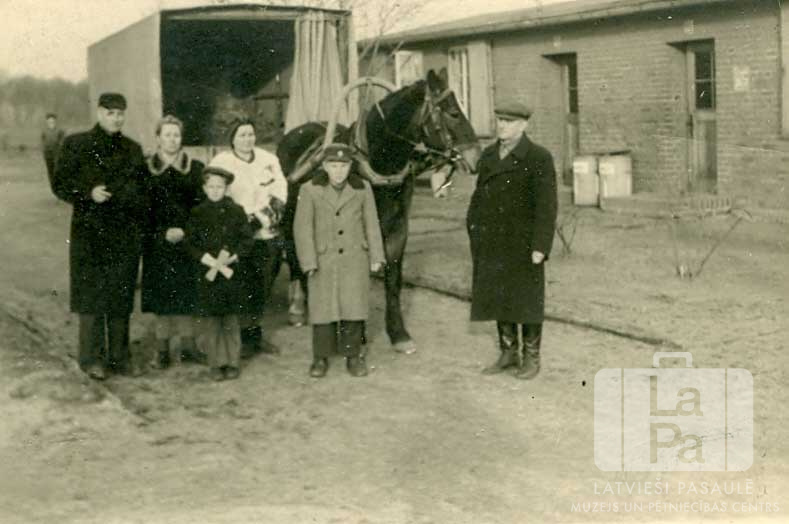 Caunes ģimene ar zirga vilktu pajūgu Montgomerija nometnē Dorverdenē (angļu zonā). Pajūgs ir slēgts, pārvilkts ar audumu, ar atvērtiem aizkariem priekšā. Fonā ir vienstāvu mūra ēka. Zirgs Ansis atceļoja ģimenei līdzi no Latvijas. No kreisās: J. Karnītis, ? Karnītis, Jānis Karnītis, Lūcija Caune, Marģers Caune un Viļums Caune.