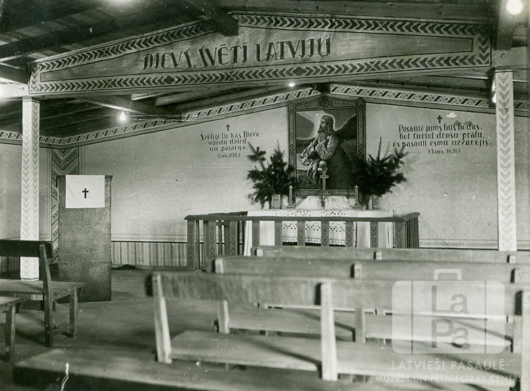 Baznīcas iekšskats Montgomerija nometnē Dorverdenē (angļu zonā). Priekšplānā ir koka solu rindas, aiz tām ir ar gaišu galdautu apsegts altāris, uz kura ir egļu zari vāzēs un koka krusts. Virs altāra ir glezna, tās kreisajā pusē ir citāts: "Svētīgi tie kas Dieva / vārdu dzird / un pasarga. / (Luk, 11.28.)". Gleznas labajā pusē ir citāts: "Pasaulē jums būs bēdas, / bet turiet drošu prātu, / es pasauli esmu uzvarējis. / (Jāņa, 16.33)". Kreisajā telpas stūrī ir mācītāja kancele. Telpas vidū, uz griestu pārkares, ir uzraksts: "DIEVS, SVĒTĪ LATVIJU".