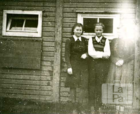 Puisis ar divām jaunietēm pie skolas barakas logiem Montgomerija nometnē Dorverdenē (angļu zonā). Labi saskatāmi ir divi cilvēki; labajā attēla pusē ir gaišs plankums, kas aizsedz trešo jaunieti. No kreisās: Ilona Lemkina un Ivars Breikšs.