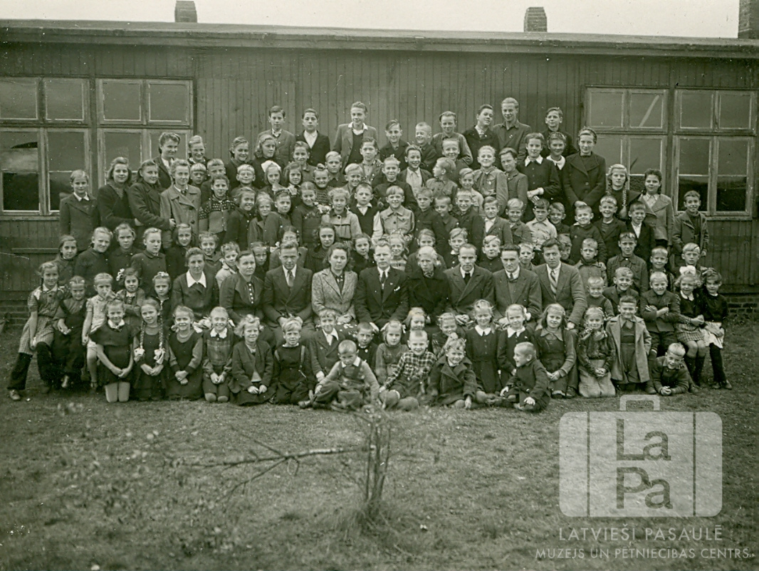 Pamatskola un Andreja Pumpura ģimnāzija Zēdorfas nometnē (angļu zonā), tautskolas gadu sākot. Liela skolēnu un skolotāju grupa vairākās rindās vienstāvu koka barakas priekšā, pie loga. Otrajā rindā sēž pieaugušie, no kreisās: septītā Lūcija Caune, astotais Pēteris Nesaule (mācītājs), desmitais Jānis Vaivods un trīspadsmitais Artūrs Liepkalns. Ceturtajā rindā, no kreisās: pirmā Māra Cibante, ceturtā Valda Blūma un piektā Ērika Grauduža. Piektajā rindā, no kreisās: pirmā Ilze Sapraša, otrā Skaidrīte Svinne, trešā Ingrīda Kārkliņa, divpadsmitā Inta Gaide un trīspadsmitā Astrīda Gruzdiņa. Sestajā rindā, no kreisās: otrais Anatolijs Borovskis un sestais Imants Lemkins.