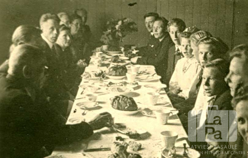 Absolventi, skolotāji un vecāki sēž pie galda pamatskolas izlaiduma svinībās Zēdorfas nometnē (angļu zonā). Izlaidumā piedalījās skolēni, kas bija sākuši skolas gaitas Montgomerija nometnē Dorverdenē, bet nometnes pārcelšanās rezultātā tās pabeidza Zēdorfā. Uz galda ir ēdienu un dzērienu trauki. Cilvēki sēž galdam abās pusēs.