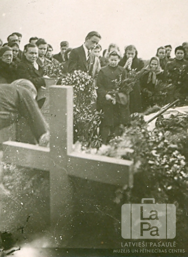 Andreja Pumpura ģimnāzijas 2. klases pārstāvis no Zēdorfas nometnes (angļu zonā) noliek vainagu pie Pētera Breikša kapa Zēvenes pilsētas kapsētā. Priekšplānā ir koka krusts. Apkārt kapam ir sastājušies izvadītāji.