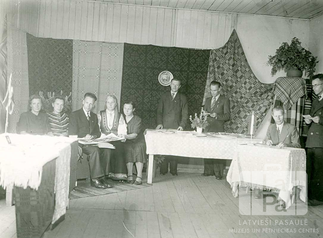 Latvisko rotu, darbu un tautastērpu izstāde Zēdorfas nometnē (angļu zonā). Vairāki cilvēki sēž uz krēsliem un aiz galda, trīs vīri stāv kājās. Telpā ir vairāki galdi ar rokdarbiem, aizmugurē, pie koka dēļu sienas, ir piestiprinātas austas segas. Uz diviem galdiem ir mazi Latvijas karogi. Kreisajā pusē, vidū, sēž Pēteris Nesaule (mācītājs).