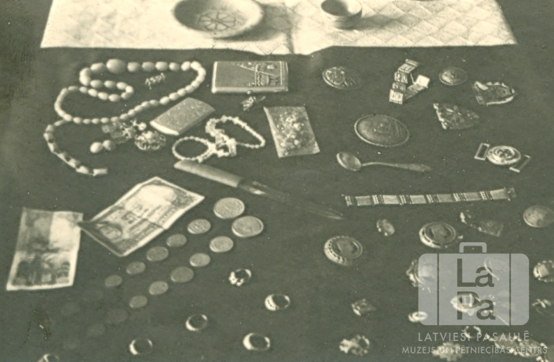 Amatnieku darinājumi latvisko rotu, darbu un tautastērpu izstādē Zēdorfas nometnē (angļu zonā). Uz galda ir monētas, gredzeni, naudas zīmes, nazis, kaklarotas, trauki, piespraudes un citi izstrādājumi.