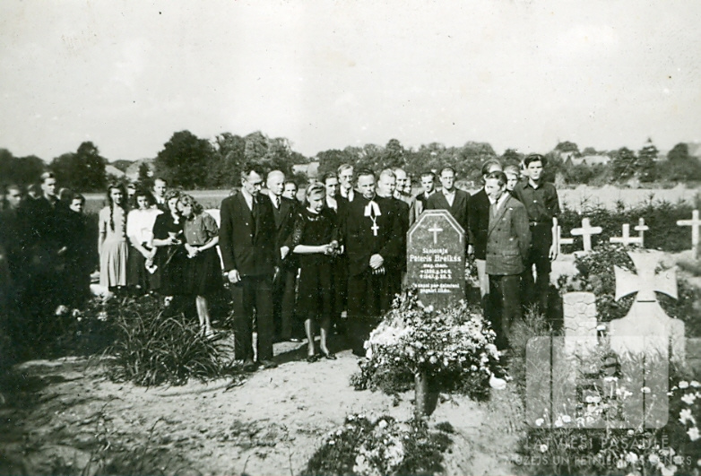 Cilvēku grupa no Zēdorfas nometnes (angļu zonā) pie Andreja Pumpura ģimnāzijas skolotāja Pētera Breikša kapa viņa pieminekļa iesvētīšanas dienā Zēvenes pilsētas kapsētā 1947. gada vasarā. Uz kapa ir ziedi. Labajā pusē ir redzami vairāki citi kapi, klāti ziediem. Fonā lauks, aiz tā caur kokiem ir redzamas vairāki mūra ēku jumti. Priekšplānā, no kreisās: pirmais Mārtiņš Gaide (ģimnāzijas direktors), trešais Pēteris Nesaule (mācītājs amata tērpā). Aiz mācītāja ir redzams Jānis Vaivods (pamatskolas pārzinis).