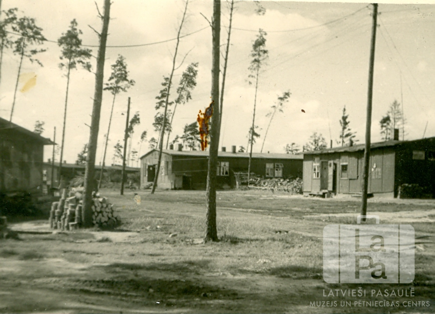 Vienstāvu koka barakas Rotenburgas nometnē (Vimmē, angļu zonā). Priekšplānā ir neliels laukums, kreisajā pusē, pie koka, ir novietota neliela malkas grēda. Redzamas vairākas atsevišķi augošas, augstas priedes.