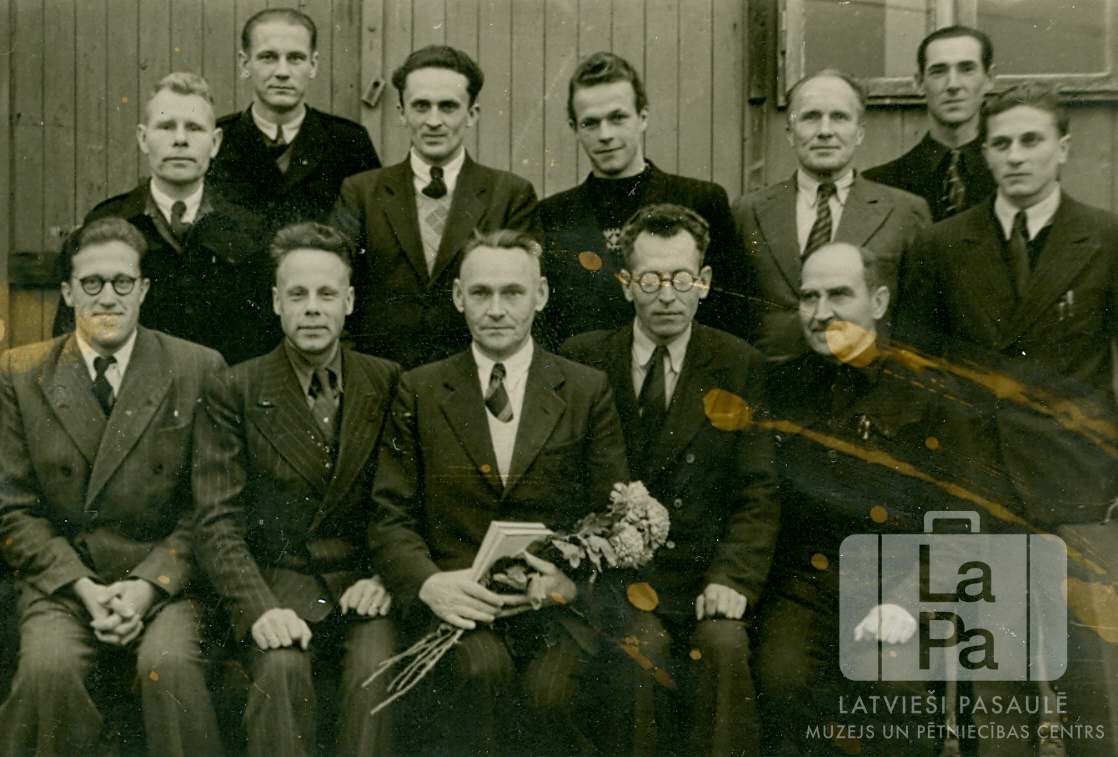 Andreja Pumpura ģimnāzijas skolotāji Rotenburgas nometnē (Vimmē, angļu zonā) sveic skolas inspektoru Konrādu Kārkliņu viņa 50 gadu dzimšanas dienā. Vīriešu grupa uzvalkos divās rindās pie koka ēkas. Pirmajā rindā sēž, no kreisās: Arnolds Runģis, Pēteris Nesaule (mācītājs), Konrāds Kārkliņš (ar ziediem), Mārtiņš Gaide (ģimnāzijas direktors) un Kārlis Freimanis. Otrajā rindā stāv, no kreisās: Jānis Vaivods, Valentīns Dvarionovičš, Artūrs Liepkalns, Filips Andersons, Arvīds Jurēvics, Alfrēds Freimanis un Visvaldis Briedis.