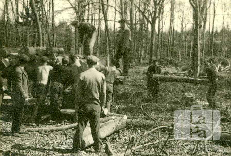 Vīri krauj baļķus smagajā mašīnā mežā pie Rotenburgas nometnes (Vimmē, angļu zonā). Vairāki vīrieši baļķus kārto mašīnā; kreisajā pusē divi vīrieši nes vienu baļķi uz mašīnu.