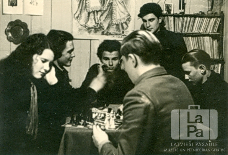 Seši jaunieši pie šaha galda Rotenburgas nometnē (Vimmē, angļu zonā). Fonā kreisajā pusē pie sienas ir dekoratīvs šķivis un zīmējumi; labajā pusē ir plaukts ar grāmatām/ platēm (?).