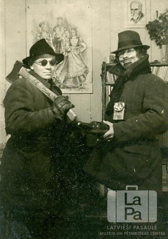 Divi jaunieši kostīmos Rotenburgas nometnē (Vimmē, angļu zonā). Puisis kreisajā pusē pār plecu tur cirvi, uz deguna viņam ir apaļas saulesbrilles. Puisi labajā pusē rokā tur pudeli, pie mēteļa viņam ir piesprausts lukturis, uz sejas ir brilles, mākslīgā bārda un ūsas. Fonā pie sienas ir zīmējums ar tautumeitām; labajā pusē ir plaukts ar grāmatām/ platēm (?). No kreisās: Marģers Caune un Jānis Lipiņš.