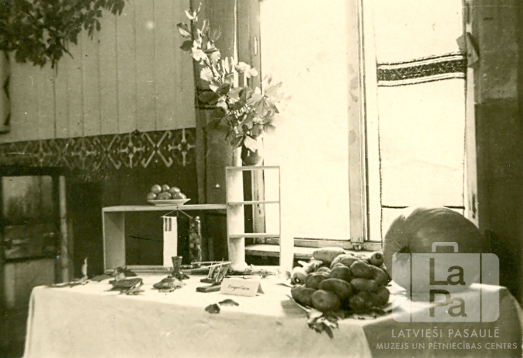 Marģera Caunes galds mazpulku darbu izstādē Rotenburgas nometnē (Vimmē, angļu zonā). Uz galda ir paša pagatavoti tautiski priekšmeti un izaudzēti kartupeļi un ķirbis. Aiz galda ir logs. Telpa ir dekorēta ar koku zariem.