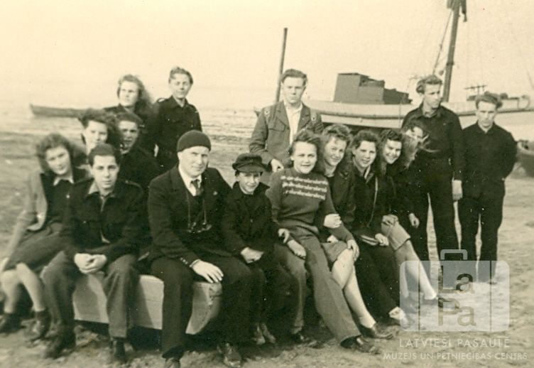 Andreja Pumpura ģimnāzisti no Emdenes nometnes ekskursijā un dabas mācības stundā uz Ziemeļjūru pie Bokhornas pilsētas (angļu zonā). Jaunieši ar skolotāju (?) pie koka sola. Fonā ir neliels kuģis. Uz sola sēž, no kreisās puses: Osvalds Blauss (aizmugurē), Inta Gaide (aizmugurē), Astrīda Gruziņa, Anatolijs Borovskis, Arvīds Jurēvics (skolotājs), nezināms, Ingrīda Kārkliņa, Valda Blūma, Ērika Grauduža, Vilma Knospe un nezināms. Aizmugurē stāv, no kreisās: Ilze Sapraša, nezināms, Marģers Caune, Uldis Zaķis un nezināms.
