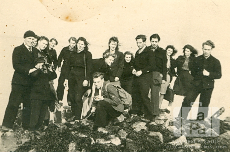 Andreja Pumpura ģimnāzisti no Emdenes nometnes stāv uz akmeņiem ekskursijā un dabas mācības stundā uz Ziemeļjūru pie Bokhornas pilsētas (angļu zonā). Priekšā viens jaunietis ir notupies ceļos, kreisajā pusē ir vīrietis stāv ar binokli pie acīm. Priekšā: Marģers Caune (ar mugursomu). Aizmugurē ir redzami: Arvīds Jurevičs (skolotājs), Astrīda Gruziņa, nezināms, Uldis Zaķis, Ērika Grauduža, Ilga Grauduža, Valda Blūma, Ilze Sapraša, Edgars Libers, Anatolijs Borovskis, Vilma Knospe, Inta Gaide un nezināms.