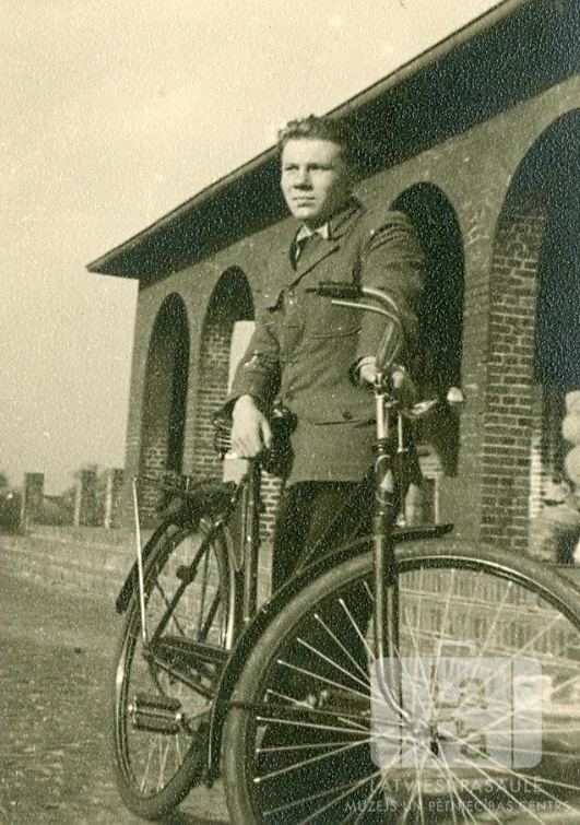 Fotogrāfijas dāvinātāja rakstītais atmiņu stāsts par bēgļu gaitām un bēgļu nometnēm: "Savas bēgļu gaitas sāku 1944. gada 27. jūnijā, kad atstājām Jaunjelgavu un pārbraucām uz Vidzemi. Bēgšana tālāk sākās pēc 18. septembra, kad Jaunjelgavu ieņem krievu karaspēks. Braucot kopā ar saimnieku no Sērenes pagasta, nonācām Kurzemē pie Durbes ezera. Liepājā iebraucām decembŗa sākumā un izcietām daudzus krievu uzlidojumus un bumbošanu. No Liepājas izbraucām Ziemassvētku vakarā un Gotenehafenā iebraucām 26. decembrī. Vēlāk ar preču vilcienu nonācām Gistrovā, Meklenburgā, kur dzīvojām Schonwalden muižā. Krievu armijai tuvojoties, sākām atkal bēgt [ar ratiem, ar kublu un, zirgam Ansim velkot]. 1945. gada 3. aprīlī mēs kopā ar tūkstošiem bēgļu un vācu karavīriem visi lēnām virzījāmies uz Libekas pusi. Krievi mūs panāca 5. maijā pie Dassow pilsētiņas. Bijām laimīgi, ka pēc trim dienām Otrais pasaules karš beidzās. Baidoties no krieviem, mēs turpinājām savu bēgšanu vakaru virzienā. 1945. gada 1. jūlijā iebraucām Saules bēgļu nometnē pie Gēsthachtas. Saules DP nometnē sāku apmeklēt pamatskolas 4. klasi, bet nepagāja ne pāris mēneši, kad devāmies tālāk uz vakariem. Nākamā nometne [pēc apmēram 375 km ceļojuma no Gistrovas pilsētas] bija Montgomērijas DP nometne pie Dorferdenes, kuŗā bija turpat 2000 lietuviešu bēgļi, bet tikai 300 latvieši. Latvieši izveidoja dievnamu Montgomerijas DP nometnē Doerferdenē, iztīrot un pārveidojot bijušo nometnes zirgu stalli. Tā kā šinī nometnē latviešu skolai nebija ceturtā klase, sāku mācīties piektajā klasē. Tautskola darbojās Montgomerija DP nometnē Doerferdenē no 1945. gada 3. jūlija līdz 1946. gada 14. aprīlim, kad nometne tika pārcelta uz Zedorfas DP nometni, kur skola turpināja iesākto darbu. 1946. gada 23. martā Vācijas ziemeļus piemeklēja smaga sniega vētra. Tā iespaidoja arī Montgomērijas DP nometni Doerferdenē, kas bija uz dienvidaustrumiem no Brēmenes. 1946. gada 14. aprīlī mēs nonācām Zēdorfas bēgļu nometnē pie Zēvenes. Nometnē bija 2100 lietuvieši, 1700 latvieši un 200 igauņi. Zēdorfas DP nometnē nobeidzu latviešu pamatskolu un sāku mācīties Andreja Pumpura ģimnāzijas pirmā klasē, kuŗā bijām 21, bet visā ģimnāzijā 54 skolnieki. Andreja Pumpura ģimnāziju nodibināja 1945. gadā Zedorfa DP nometnē pie Zēvenes. Skolas vārds un darbība turpinājās līdz 1950. gada pavasarim, lai arī nometņu iedzīvotāji un skolnieki tika pārvietoti uz Rotenburgas, Bokhomas un Emdenes DP nometnēm. Zēdorfa DP nometne radās 1946. gada pavasarī, kad ieradās no Beļģijas mūsu bijušie leģionāri. Drīz nometnei pievienojas tautieši no Buxtehudes un Mongemēy DP nometnēm. Uz mācītāja Pētera Nesaules ierosinājumu nodibināja Andreja Pumpura ģimnāziju. Skola uzsāka mācības 26. jūnijā, 1946. gadā. Pirmā gadā bija 54 skolnieki, no kuriem pirmā klasē bija 20 un piektā 7 skolnieki. Katra klase sagādāja galdus un solus un iztīrīja un izkrāsoja ierādītas telpas. Katrs skolnieks noziedoja 20RM, lai skola varētu iegādāties vienu rakstāmmašīnu. Skola turpināja savu iesākto darbu, lai, ar pārceļoties uz Rotenburgas, Bochomas un Emdenes DP nometnēm. Skolas pēdējais gads bija 1949/1950. gads Emdene DP nometnē. Pēc neilga laika tiekam atkal pārcelti, šoreiz uz Rotenburgas DP nometni. Šinī nometnē paliku drusku ilgāk, gandrīz divus gadus. Nākamā nometne bija Bokhornas DP nometne – tikai 2 mēneši; pēdējā nometnē, Emdenes DP nometnē, nodzīvojām 18 mēnešus. Emdenes DP nometne bija kādreizējās Lielvācijas jūrnieku kazarmas, un tāpēc nometnē bija divas lielas betona patvertnes, uz kuŗām kaŗa laikā bija zenītartilērijas lielgabali. Laikā, kad mēs tur dzīvojām, angļu militārā valdība tās piepildīja ar ūdeni un saspridzināja, izraisot plūdus mūsu dzīvojamo ēku pagrabos. Nometni slēdza 1950. gada februārī. Ventorfas un Grohnas caurbraukšanas nometnēs – pa mēnesim katrā nometnē. Vāciju atstājām 1950. gada 15. janvārī ar kuģi "USAT General Hersey" un ieradāmies New Orleānā 1950. gada 29. janvārī."
