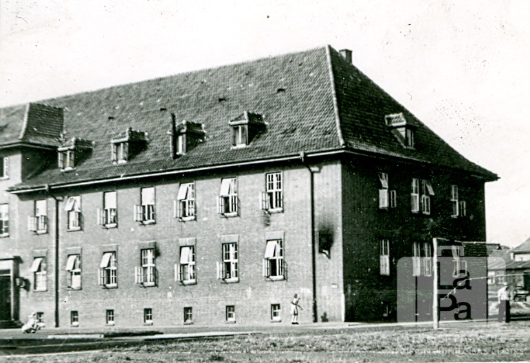 Divstāvu mūra ēka Emdenes nometnē (angļu zonā) 1949. gada vasarā. Priekšā ir laukums; labajā pusē ir redzams volejbola tīkls, pie tā stāv cilvēks. Labajā pusē ir bloka māja Nr. 4, kurā bija nometnes administrācija un latviešu skola.