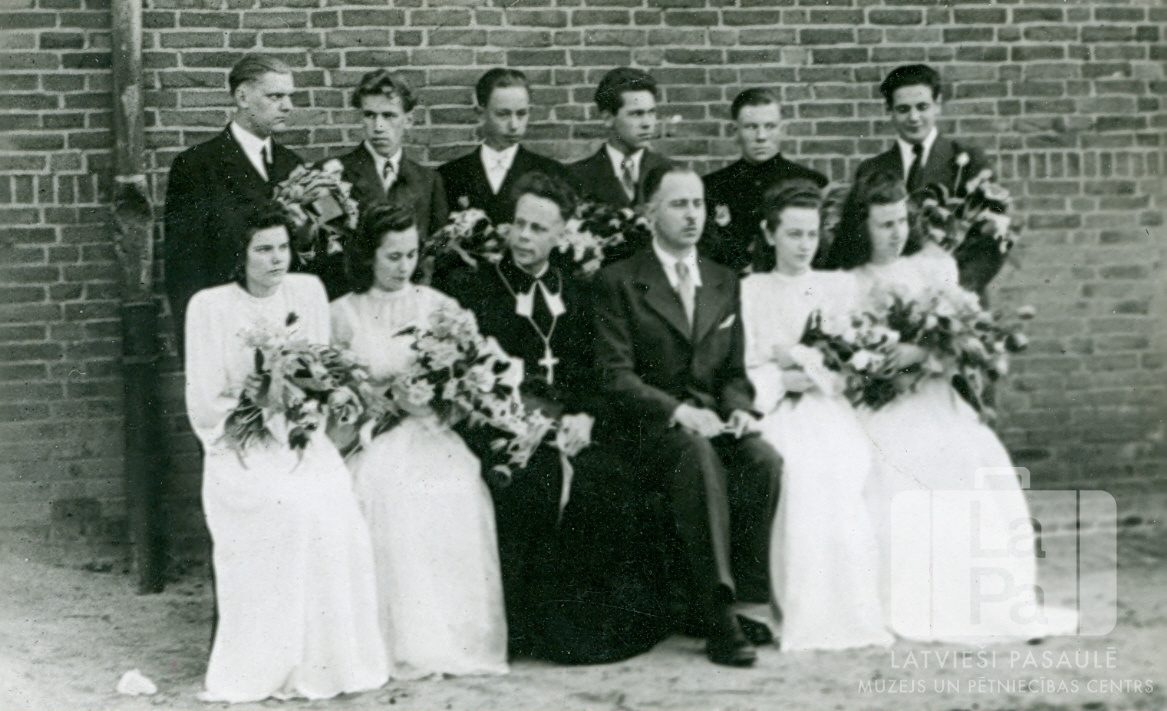 Jaunieši iesvētībās Emdenes nometnē (angļu zonā). Jaunietes ir ģērbušās gaišās kleitās, puiši un vīrieši – uzvalkos. Pirmajā rindā, vidū, sēž mācītājs amata tērpā. Fonā ir ķieģeļu siena. Priekšā sēž, no kreisās: Vilma Knopse, Ausma Iše, Pēteris Nesaule (mācītājs), nezināms (draudzes priekšnieks), Valda Blūma un Izolde Druvkalne. Aizmugurē stāv, no kreisās: Roberts Ozoliņš, Uldis Zaķis, Ivars Dombrovskis, Jānis Lipiņš, Marģers Caune un Osvalds Blauss. Par šo gadījumu Marģers Caune stāsta: "Šīs bija pirmās no četrām iesvētībām Emdenes DP nometnē 1949. gadā. 1949. gadā dīpīšu izceļošana uz aizjūras zemēm bija augstā līmenī. Mums nebija skaidrība, kas mūs sagaida mūsu jaunās mājās, un tāpēc vecāki nolēma jauniešus iesvētīt DP nometnēs pirms izceļošanas."